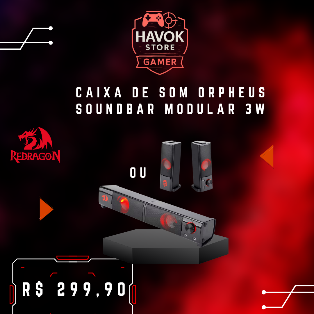 Em até 6x de R$ 54,98 sem juros À vistaR$ 299,90no Pix, Débito ou Dinheiro! Eleve seu áudio com o Orpheus Soundbar: 2 × 3 W de potência, formato modular “soundbar/alto-falantes”, design compacto que se adapta à mesa ou embaixo do monitor, entrada USB + 3,5 mm plug-and-play, som claro e estilo imediato para seu setup hoje.