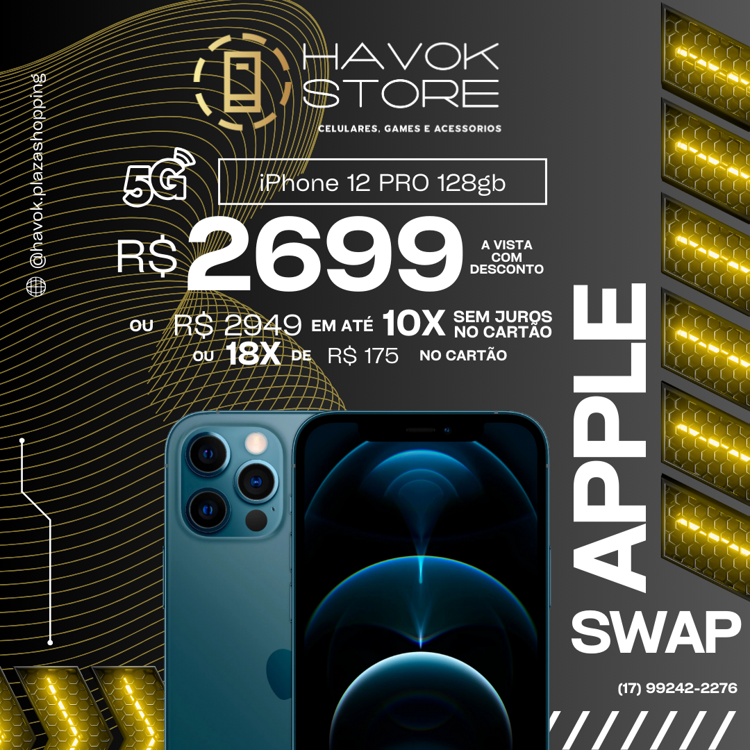 O iPhone 12 Pro chega com tela Super Retina XDR de 6,1″, chip A14 Bionic, sistema de três câmeras 12 MP + sensor LiDAR, certificação IP68, suporte 5G e armazenamento de 128 GB, pronto para atender seu dia com potência e estilo agora.