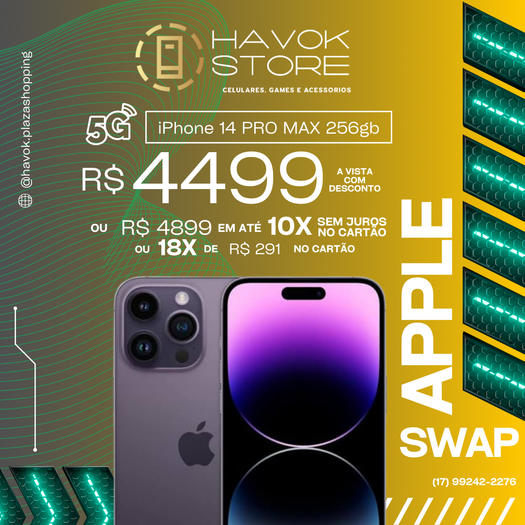 Em até 10x de R$ 489,90 sem jurosEm até 18x de R$ 288,53 com juros À vistaR$ 4.499,00no Pix, Débito ou Dinheiro! O iPhone 14 Pro Max combina tela Super Retina XDR de 6,7″ com 120 Hz, chip A16 Bionic, câmera Pro de 48 MP com estabilização avançada, design em aço cirúrgico e proteção IP68, máximo desempenho, estilo e autonomia para quem exige o melhor.