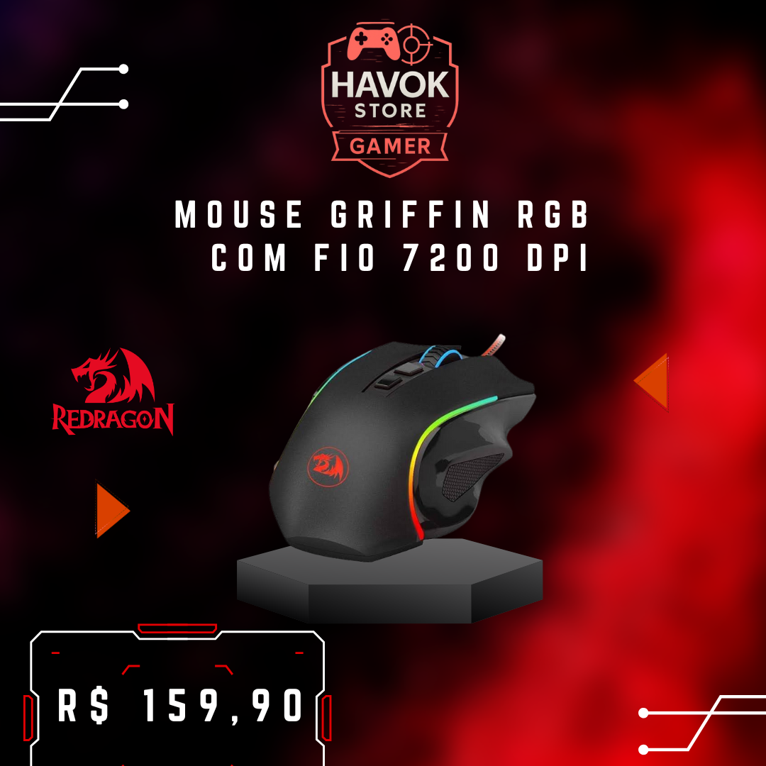 Domine seu jogo com o Mouse Griffin RGB 7200 DPI: sensor ajustável até 7200 DPI, iluminação RGB personalizável, 7 botões programáveis e conexão por fio para resposta imediata, desempenho preciso e estilo no seu setup gamer.