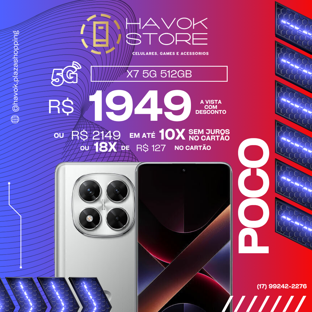 Em até 10x de R$ 214,90 sem jurosEm até 18x de R$ 126,57 com juros À vistaR$ 1.949,00no Pix, Débito ou Dinheiro! O POCO X7 5G (256 GB) traz tela curva AMOLED de 6,67″ com 120 Hz, chip Dimensity 7300-Ultra em 4 nm, câmera de 50 MP com OIS, bateria de 5.110 mAh e proteção IP68, desempenho premium e fluidez completa para seu dia a dia agora.